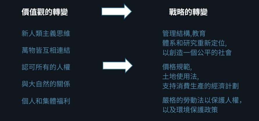 策略的轉變包括教育和研究,以研究社會的消費和生產模式。基於此類研究成果的監管結構和政策,成為使我們的經濟擺脫以利潤為導向的生產的策略。轉向新人文主義的轉變有助於立法者制定法律,透過強而有力的立法來保護當地合作社、人權和環境。所有這些措施在去中心化經濟中齊頭並進,重點是社會經濟賦權而不是利潤。