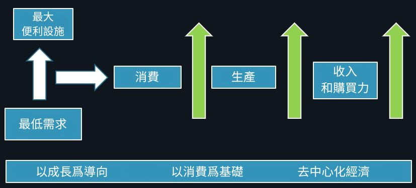 「生產是為了消費,不是為了利潤」。這是一個需要轉變思維方式和價值觀的想法。一旦我們了解了進用論消費和生產的本質,我們思考建構經濟的方式也必須經歷典範轉移,這兩者都是根據人類需求和不斷變化的生活條件逐步發展的。心理領域價值觀的轉變,轉化為實踐領域策略的轉變。